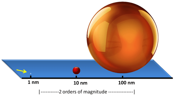 - Nanomaterial sizes range 2 orders of magnitude (1-100).
